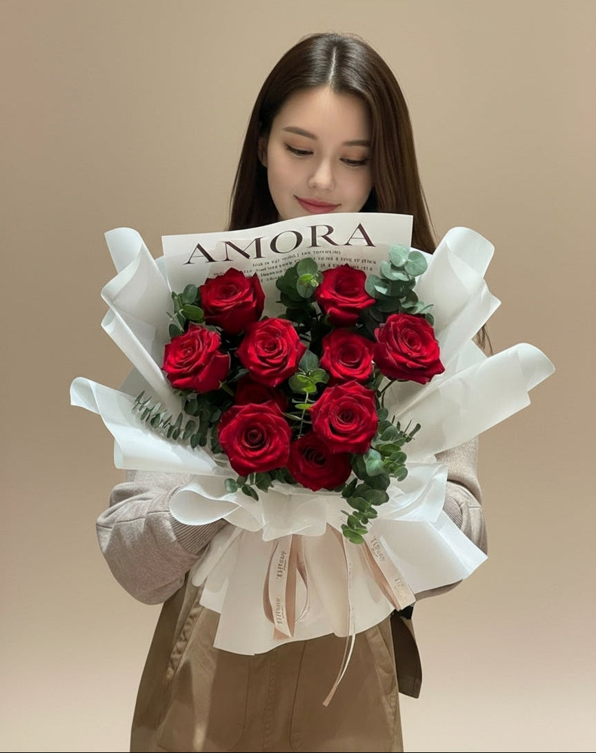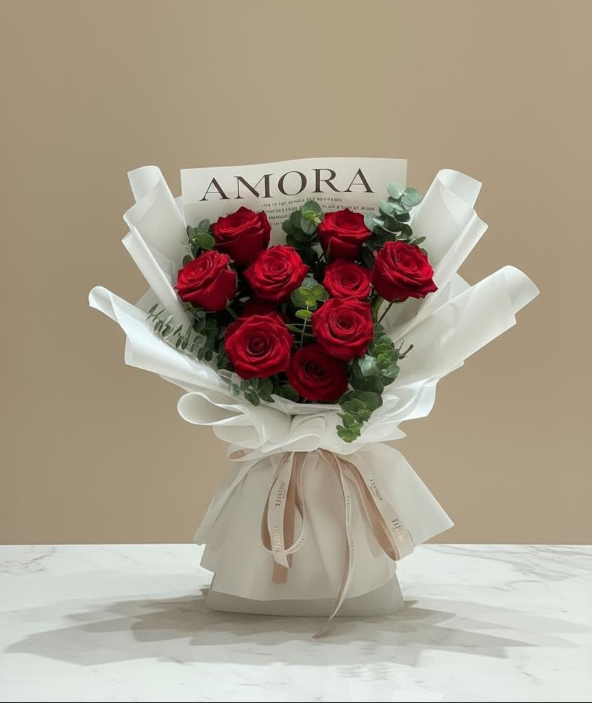 Este ramo está compuesto por 10 rosas rojas importadas, de tallo largo y botón grande, acompañadas de eucalipto fresh y envueltas en papel premium con acabado editorial —porque regalar amor también puede sentirse como recibir una portada de revista.