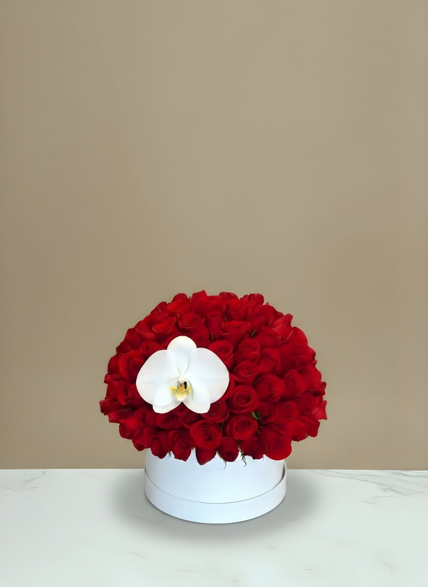 Un diseño exclusivo de Amora que reúne decenas de rosas rojas de tallo corto perfectamente dispuestas en forma domo, coronadas con una orquídea blanca que aporta contraste, delicadeza y sofisticación.