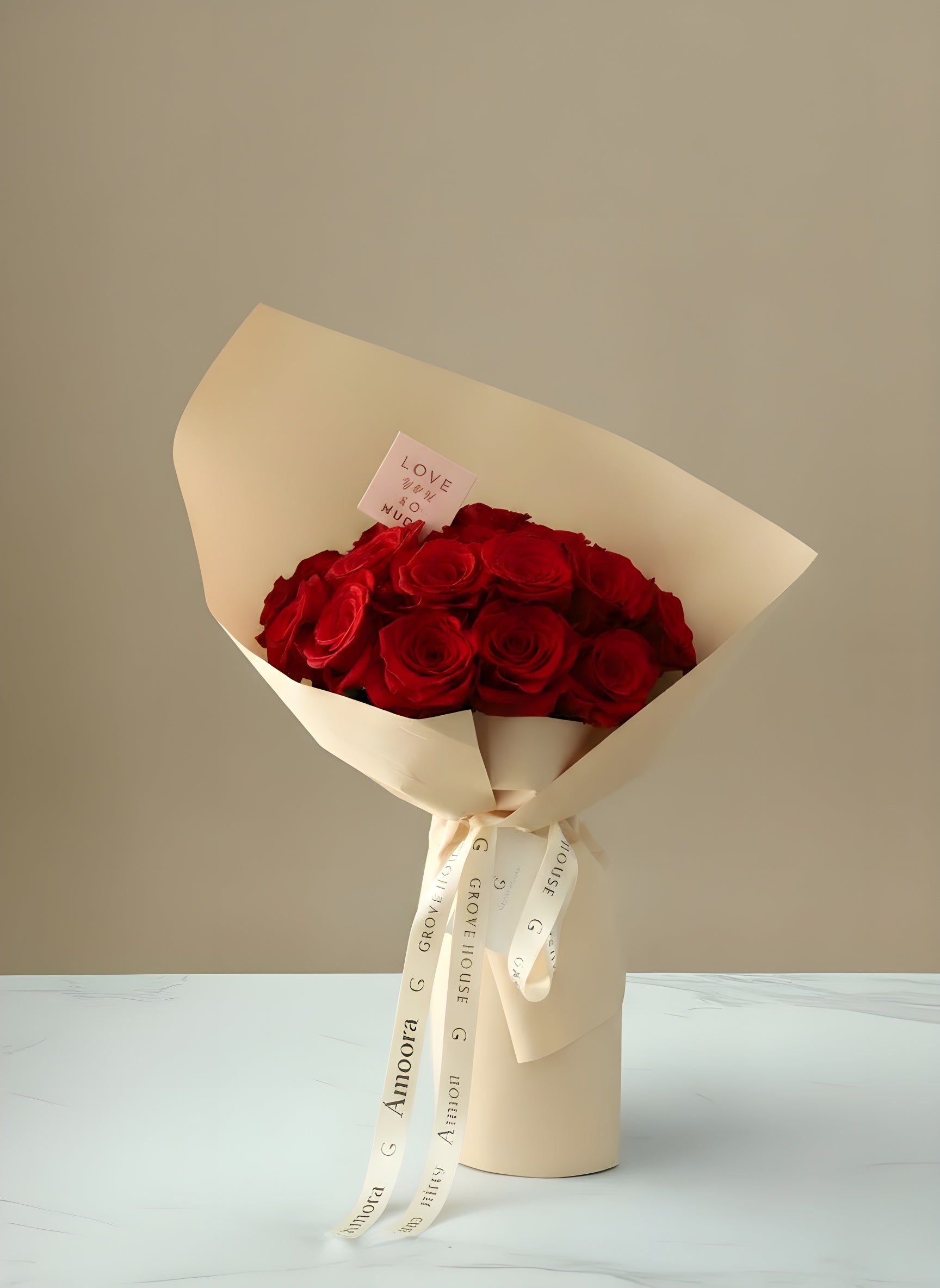 El Ramo Belle reúne rosas rojas premium cuidadosamente dispuestas en forma circular, envueltas en papel color marfil y lazo de satén, logrando un diseño elegante y atemporal que habla por sí solo.