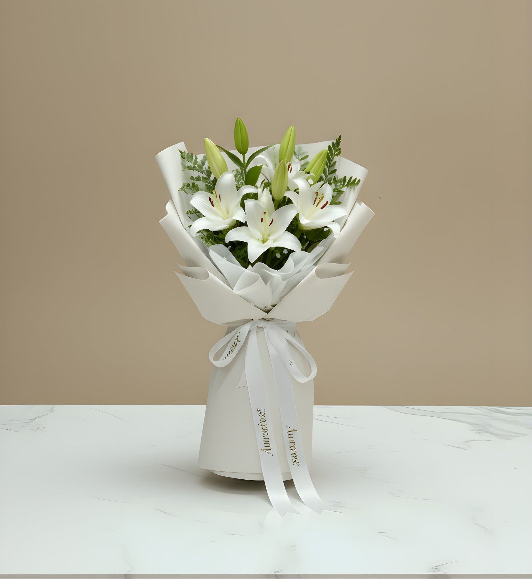 Una composición de lirios blancos premium, símbolo de amor sincero, nuevos comienzos y luz interior. Cada tallo se abre lentamente revelando pétalos suaves y perfumados, acompañados de follaje fresco y envueltos en papel marfil con lazo de satén, en el estilo minimalista y sofisticado de Amora.